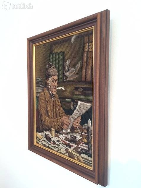 Das Gobelin Bild mit schönem passendem Rahmen zeigt den "Schreiber 1875" von A. Anker.