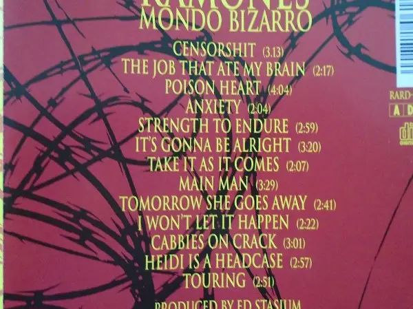 1 September 1992, die Punkband Ramones, 12tes Energisches Album, Mondo Bizarro. Gast Musiker, Vernon Reid ( Living Colour, Flo & Eddie ( Turtles ) 1 Doors Cover, Take It As It Comes, und Joey Ramone klingt wie Jim Morrison.