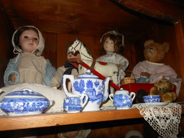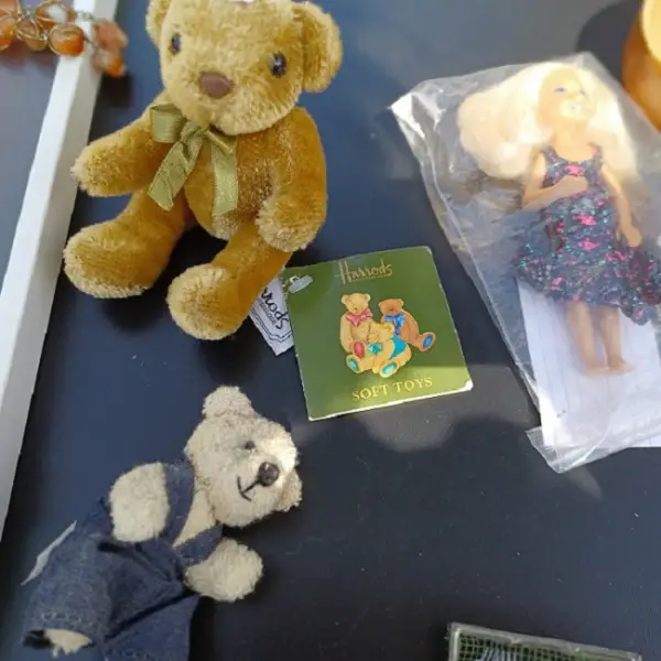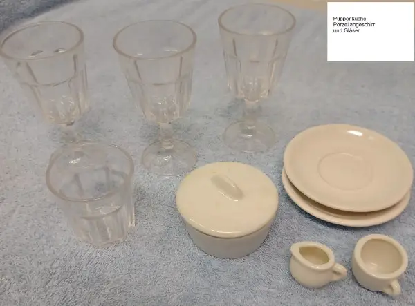 Antike Puppen Sammelsachen, Fächer, Gläser, Bügeleisen, Korb