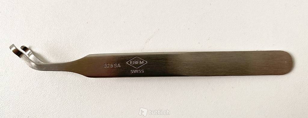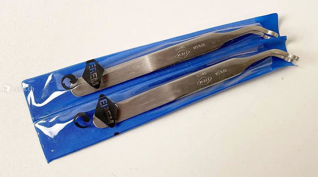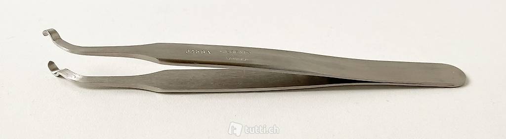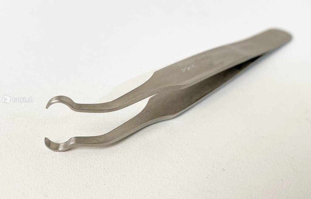 Pinzette abgewinkelt 45° mit runden Spitzen. Geeignet zum Greifen von feinen Drahten und zylindrischen Bauteilen. Spezial-Edelstahl, nicht magnetisch, rostfrei. Prei pro Stück, sind mehrere vorhanden.
