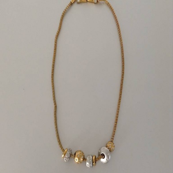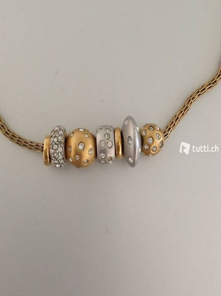 Es ist eine ganz schöne Kordelkette (kein einfaches Ketteli) mit 7 unterschidlichen Anhängern, wie Ringe, Kugeln, wie kleine Planeten, bestückt mit kleinen Brillanten / Diamanten. Wirkt sehr speziell und ist ein toller Hingucker!