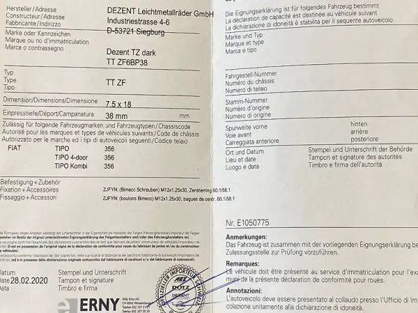 Fiat Tipo inkl. Eignungserklärung Beiblatt ( siehe Bild 3 )