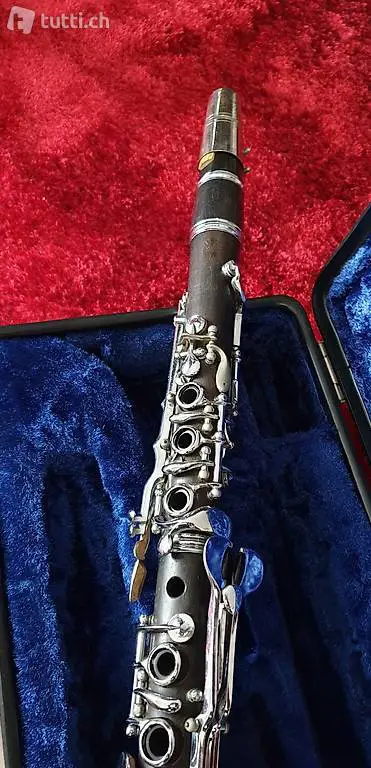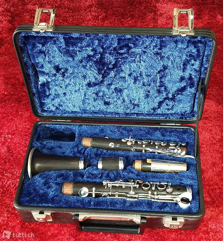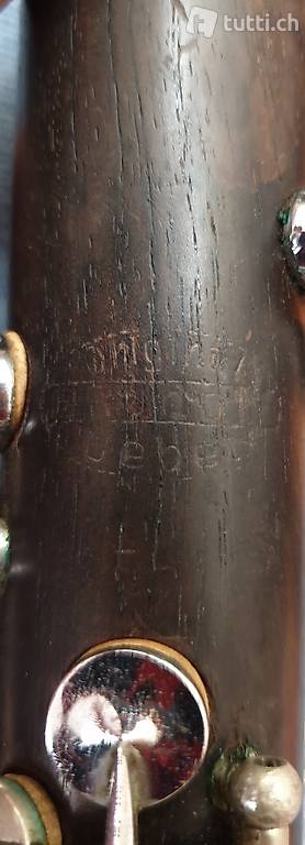 Klarinette ca. aus den fünfziger Jahre, Fabrikat und Hersteller sind für mich leider nicht mehr lesbar, das Signet, siehe Bild, ist aber noch vorhanden. Auf dem Instrument wurde vorallem Ländlermusik gespielt. Die Klarinette ist noch sehr gut erhalten und meinem Wissen nach, sollte sie noch spielbar sein. Das Instrument ist in einem schwarzen Koffer mit blauer Fütterung aufbewahrt, der Koffer ist jüngeren Datums und im Preis inbegriffen.