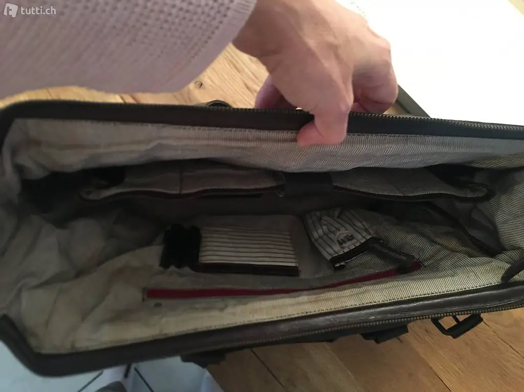 Die Tasche ist neu und ungebraucht, der Innenstoff jedoch weist Verfärbungen auf.