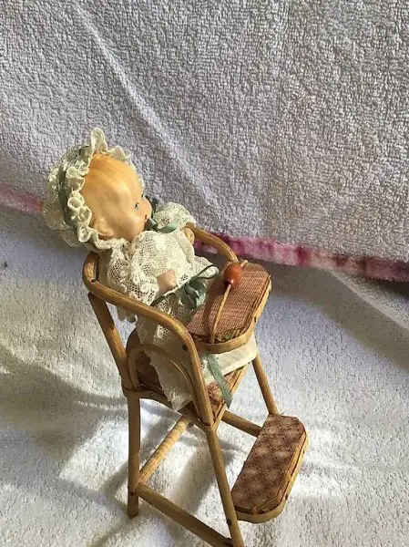 Herziges Keramik Baby im geflochtenen Hochstühli.