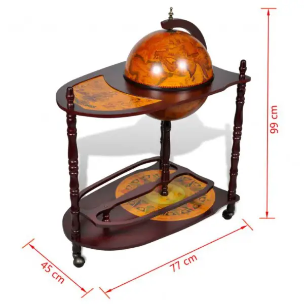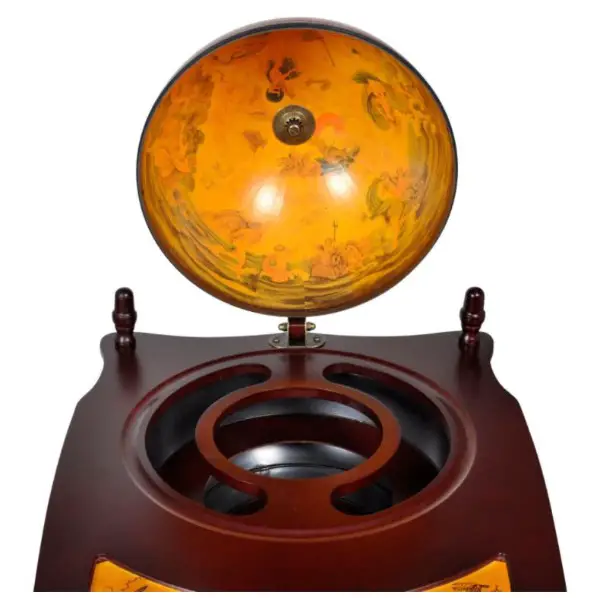 Der geöffnete Globus wird zu einer grossen Bar, in der Wein, Spirituosen, Getränke und Gläsern stilvoll aufbewahrt und präsentiert werden können, wobei Sie gleichzeitig leichten Zugang zu diesen haben werden. Ausgestattet mit einer verlängerten Tischplatte und einem Ablageboden bietet diese elegante Minibar viel Platz für Flaschen und Stielgläser. Die Aussenfläche des Globus ist mit einer Nachbildung einer alten nautischen Karte verziert, während die Tischplatte, das Globusinnere und der Ablageboden mit Gemälderepliken aus der Renaissance-Ära verschönert sind, so dass der Globus-Bar-Rollwagen ein wahres Kunstwerk und eine grossartige Dekorationslösung für Ihr Hause oder Büro wird. Die Minibar ist mit Rollen ausgestattet, so dass sie mit Leichtigkeit zum gewünschten Ort mitgenommen werden kann. Sie können den Globusbar-Rollwagen in jede Ecke Ihres Zimmers stellen. Dieser Globus-Bartisch mit Rollen ist zweifellos eine perfekte Kombination aus Aufbewahrungs- und Dekorationslösung.