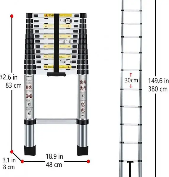 Gefaltete Höhe: 83cm, Entfaltete Höhe: 380cm, Sprossen: 13, Nettogewicht : 11,3 kg
