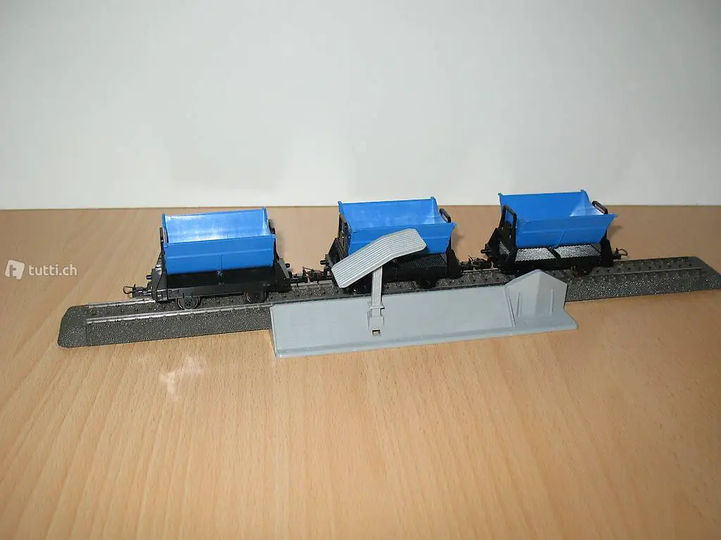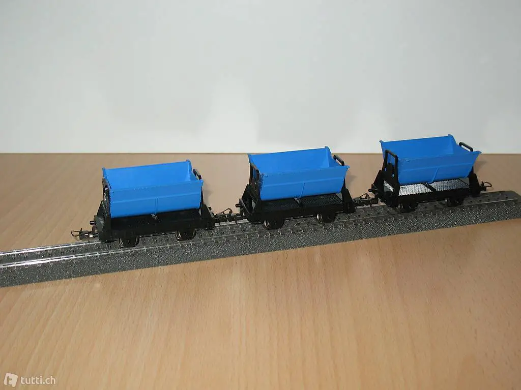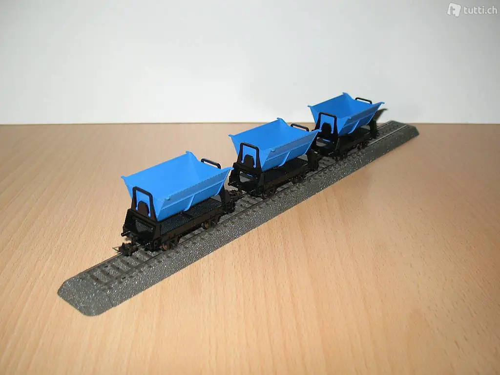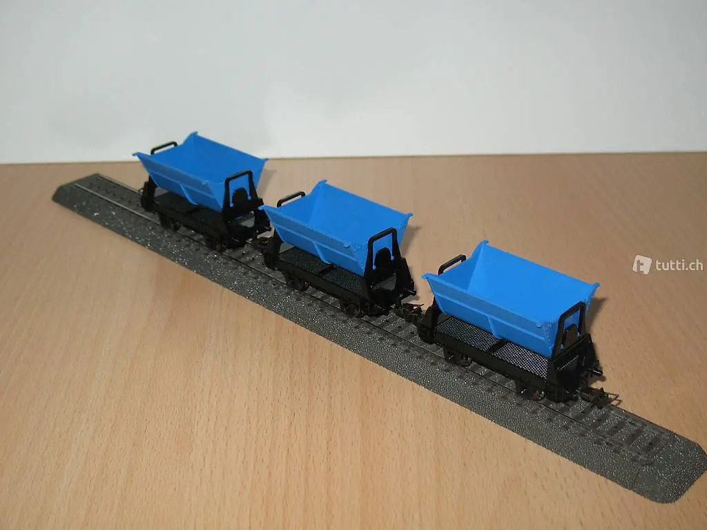 TRIX (Artikel Nr. 27035 und 27036). Das Set besteht aus 3 Kipplorenwagen mit blauer Lore, die auf beide Seiten kippbar ist. In der Mittelstellung ist die Lore gerastet. Das Set ist neu in der Original Verpackung (siehe Bilder). Das Set kann bei mir besichtigt / abgeholt werden oder nach Vorauszahlung mit der Post (plus 10.-Fr. Porto und Verpackung) versendet werden. Beachten Sie auch die weiteren Angebote.