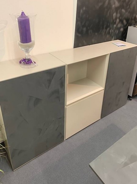 Sideboard von Willisau. Es verfügt über 2 Türen mit 2 Innentablaren, einer grossen Schublade und einer grossen Nische. Der Korpus ist in Mattlack wool und sämtliche Fronten in Stucco anthrazit. Stucco erinnert an traditionelle Spachteltechnik und ist im Hinblick auf die Strapazierfähigkeit mit dem HPL Uni voll und ganz vergleichbar.