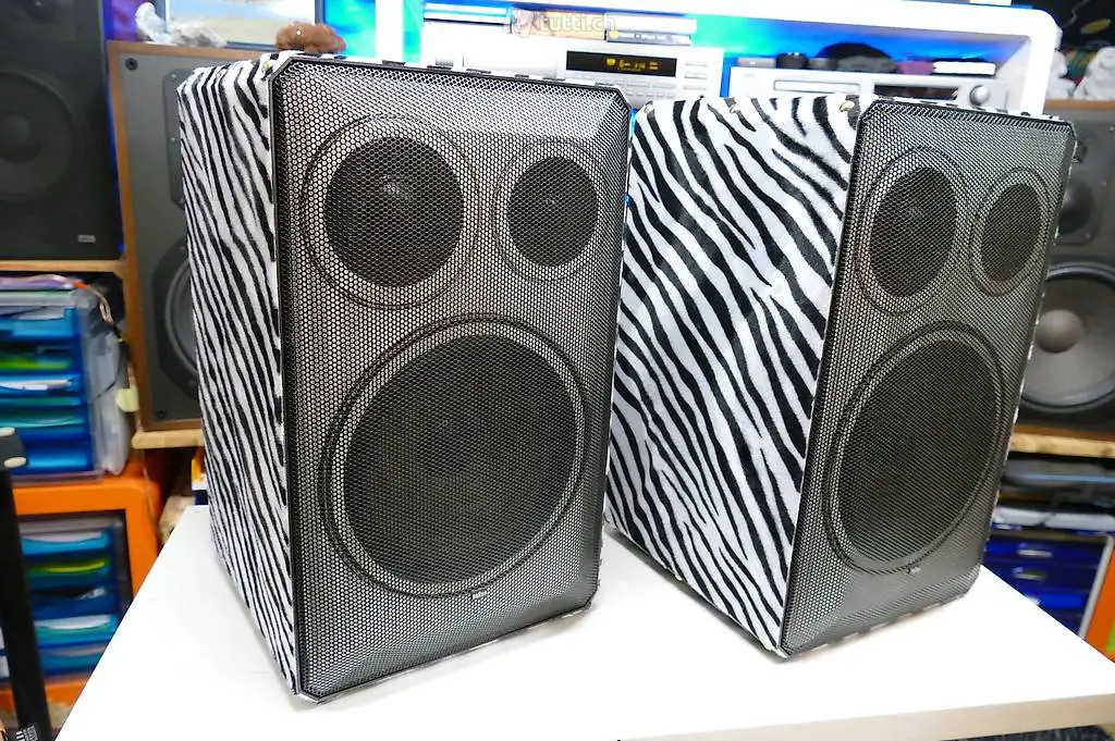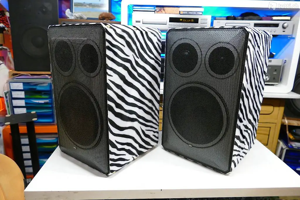 Das ganze schwarze Laminat, seitlich und oben war komplett beschädigt und nicht mehr zu reparieren. So habe ich die LS in ein neues Design verpackt. Seitlich oben und unten habe ich die LS in ein Zebra Kunstfell gepackt, die Front unter dem Abdeckgitter ist von mir mit weisser Dekor Folie eingekleidet worden, das Kunstfell habe ich mit Polsternägel fixiert. Die Rückseite ist noch in Original Zustand. Die Filzgleiter an der Unterseite habe ich erneuert.