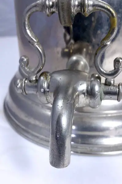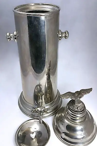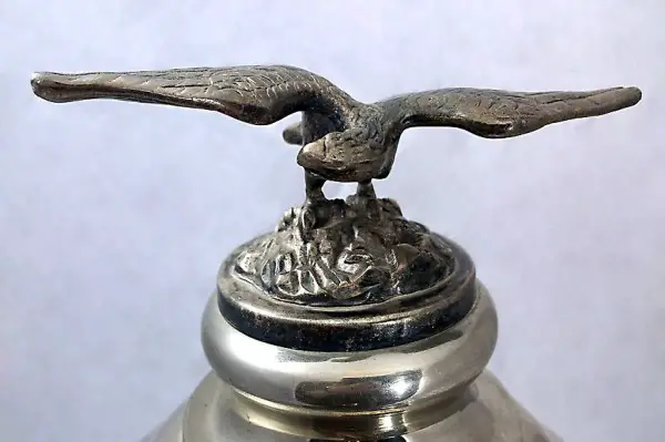 Die schön gearbeitete Adlerfigur auf dem verchromten Deckel ist versilbert. Der Ausguss wird per Kippbewegung geöffnet oder verschlossen. Am oberen Rand ist eine kleine Delle und beim inneren Deckelknopf fehlt ein kleines Teil. Die Profi