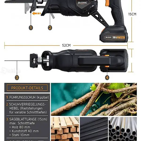 · Max. Schnitttiefe Holz: 80 mm, · Max. Schnitttiefe Stahl: 10 mm, ·