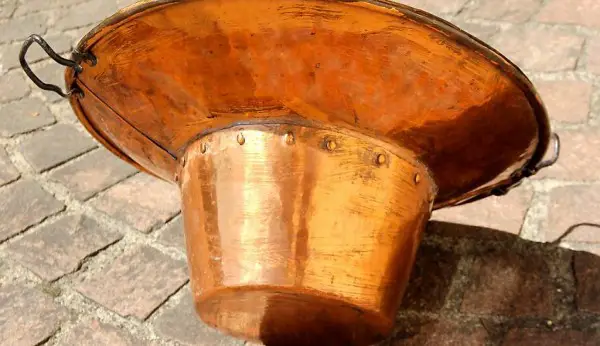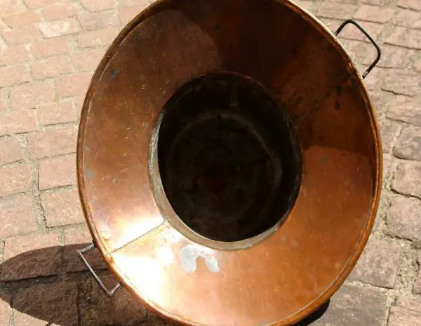 Das Kupfergefäss wurde aussen restauriert und poliert, daher toller Glanz.