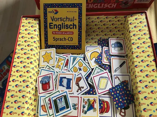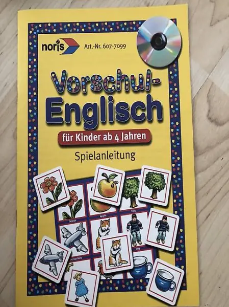 Spiel zunächst gibt es da acht lehrntafeln. Auf jeden Tafel befindet sich 9 Bilder. Unter jedem Bild steht das englische Wort.Zu jeder Tafel gibt es gleiche Bilder noch einmal als Kärtchen. Der Spass des Spieles besteht darin dass die Kinder die jeweils neun Kärtchen den neuen entsprechend Bildern auf der Tafel zuordnen!. Das Zuordnen geschieht mithilfe der Sprach CD. Ein Speaker spricht die neuen Begriffe jeder Tafel langsam und in der Reihenfolge von links oben nach rechts unten vor nach jedem gesprochenen Wort legt das Kind passende Bilderkärchen auf die Tafel so brät sich das Kind mit der Zeit die Wörter ein . Es gibt auch Übungen und Kontrolle Phasen.