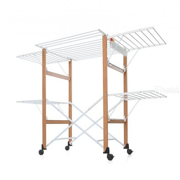 Der unnachahmliche Klassiker unter den Wäscheständern! Mit ausklappbaren Seit- und Frontalflügen, je nach aufzuhängender Wäschemenge. Komplett zusammenklappbar, mit sicheren mit Bremsen versehenen Rollen. 27m Trockenlänge. Aus robustem und wasserundurchlässigem Material, aus Aluminium oder Buche, Stäbe aus lackiertem Aluminium. Als Bonus 6 "Clothy"