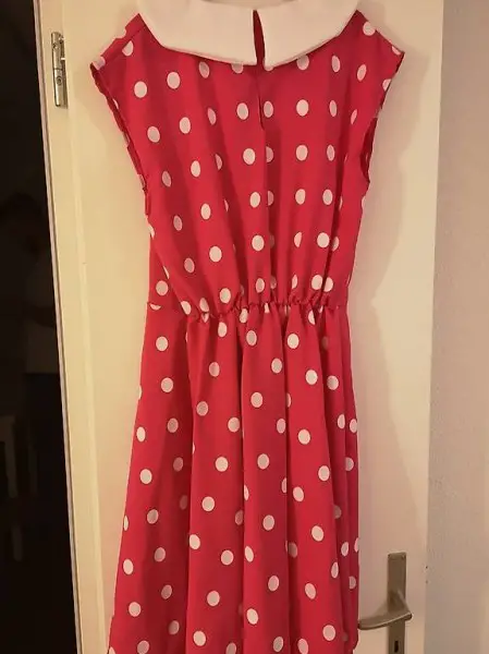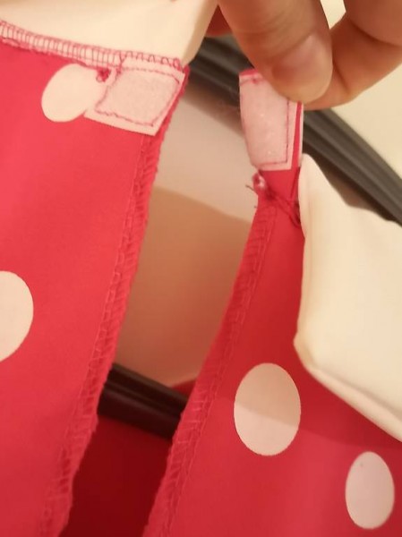 Oben hinten Klettverschluss (siehe Foto). Farbe etwas pinkiger als auf den Fotos. Scheint hier fast rot, ist aber pinkig! Siehe Beispiel letztes Foto, ist genau dieses Kleid.