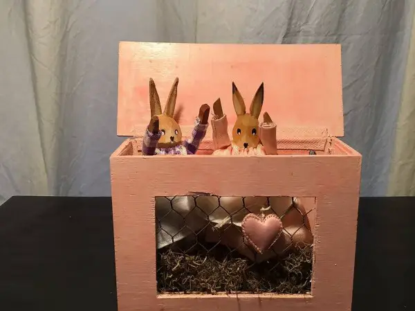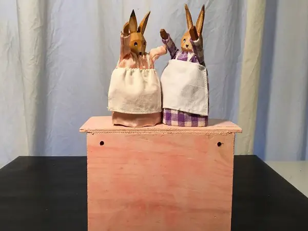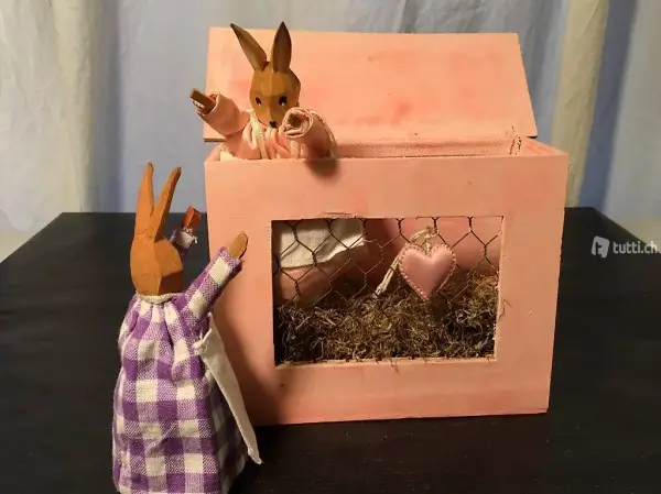 Stall und die beiden Eierwärmer-Häsli sind schon alt und haben Gebrauchsspuren.