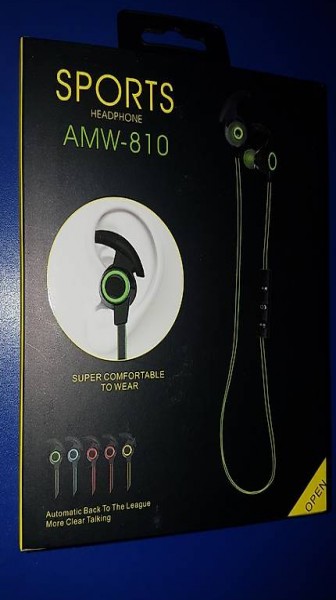 Ohrhörer ("SPORTS HEADPHONE AMW-810") mit Bluetooth sowie Knöpfen zur Steuerung der wichtigsten Funktionen.