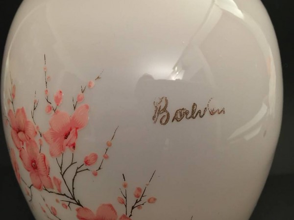 Vase rose de Murano en excellent état avec des décorations florales peintes à la main, mesurant 27x15 cm et pesant 550 gr