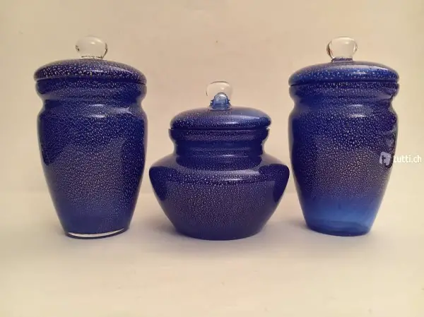3 blaue Muranoglasvasen mit Blattgold, hervorragender Zustand ohne Mängel.