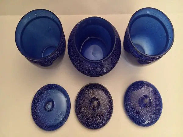 3 vasi blu in vetro di Murano con foglia in oro, condizioni eccellenti senza difetti.