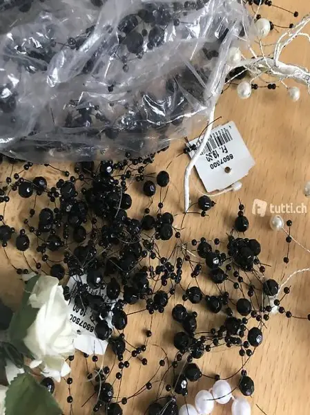 Verschiedenes Bastelmaterial, Perlen usw. z.B. für Fasnachtskeider usw. zum Teil noch origialverpackt, Neupreis der schwarzen Stränge mit Perlen pro Stk. 19.90. verkaufe alles auf dem Tisch zusammen für Fr. 10.- plus Versandkosten oder Übergabe in Bern.