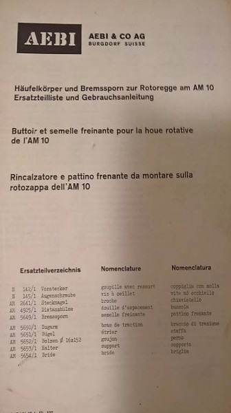 Häufelkörper und Bremssporn zur Rotoregge Aebi AM 10, 4 Seiten (PDF eingesannt ab Original)