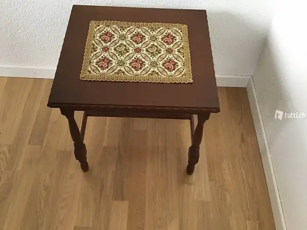 Zu verkaufen ein sehr schönes, super verarbeitetes Massiv-Holztischchen mit speziellem Rand (siehe Foto), Breite 55 cm, Tiefe 44 cm und Höhe 44 cm. Ca. 45 jährig, in Topzustand aus rauch und tierfreiem Raum. Abholpreis CHF 88.-. Freue mich auf ihren Anruf. 062 216 34 86. Danke.