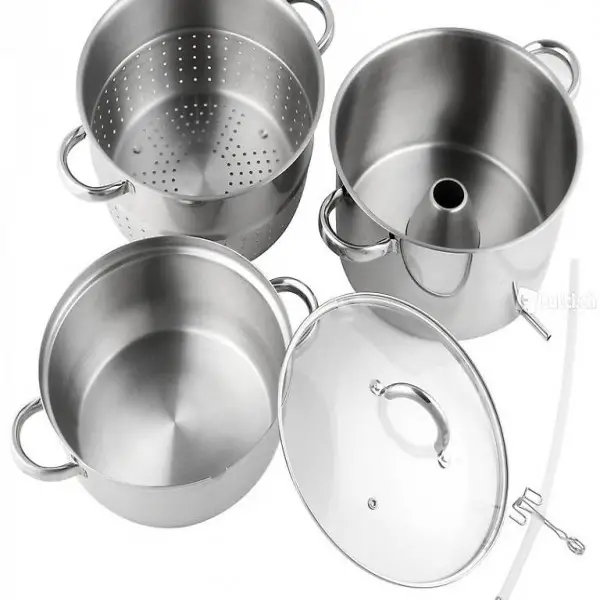 Dampfentsafter bestehend aus: Edelstahl-Wassertopf mit Sandwich-Doppelboden ? Edelstahl-Auffangbehälter - Edelstahl-Fruchtkorb (kann auch als Sieb verwendet werden) - Glasdeckel mit Edelstahlrand, Edelstahlknopf und Dampfloch - Abzapfklemme und Schlauch