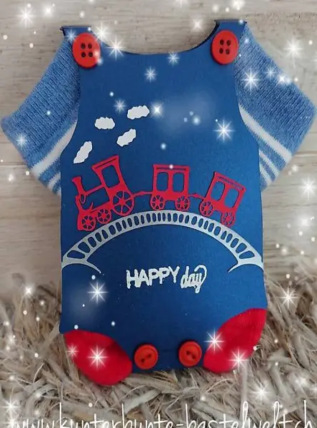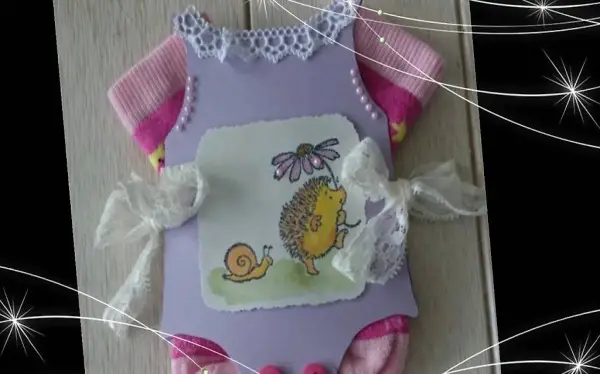 Karte als Babybody mit einem Paar Babysöckchen.