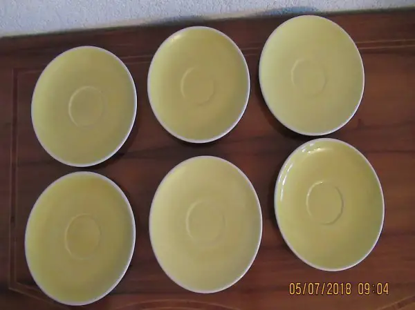 6 Unterteller, zu Tassen Rössler hellgelb Porzellan