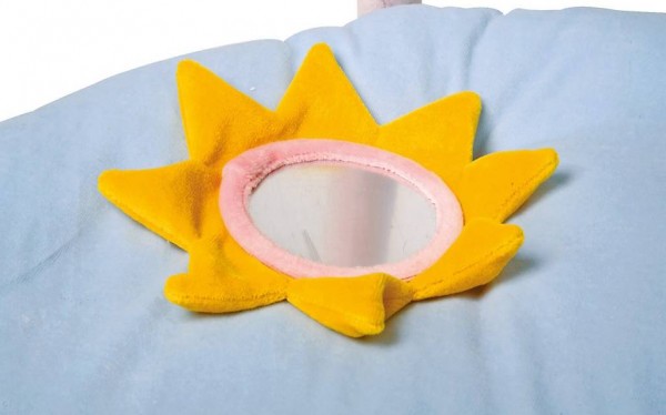 Kuschelig weiche Krabbeldecke mit aufgenähten Motiven. Eine Spiegelfolie (kann nicht brechen!) in der Sonne sowie zwei
