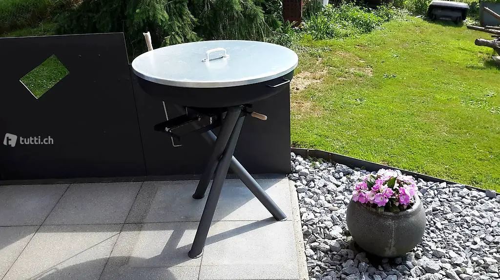 Schweizer Handarbeit: Neue Feuerschale d = 800 mm 3 mm dick, mit Aschenrost und massiver Aschenschublade und Luftzufuhr-Drosselschieber auf 3-Bein Gestell mit Nivellierfüsse, Grillplatte aus Edelstahl 10 mm dick, mit Rost d=30 cm aus Edelstahl inkl. Scheuerhaken.Gesamt höhe ca. 95 cm