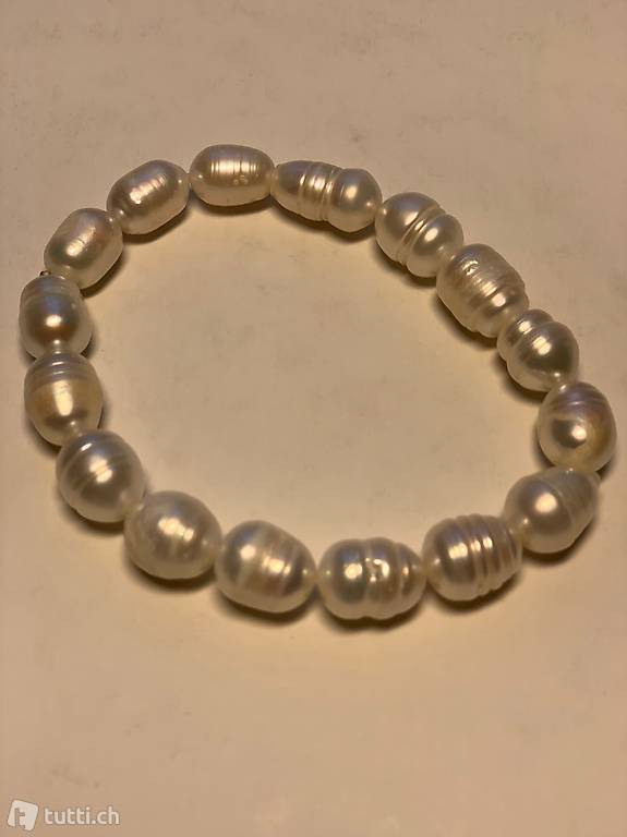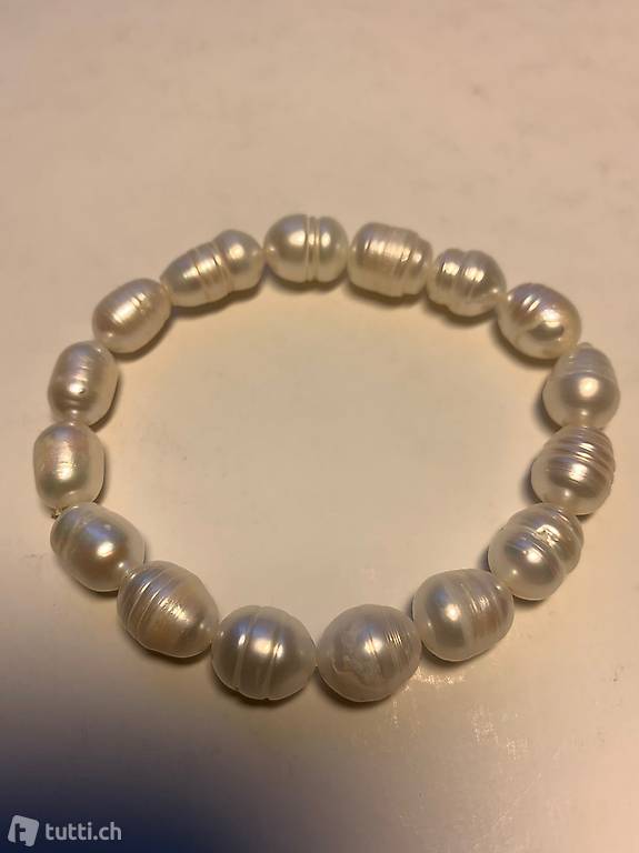 . Die Länge beträgt 20 cm. Auf Gummizug aufgezogen. Perlen Grösse 10--15 mm. Farbe Weiss. Versand 2 chf