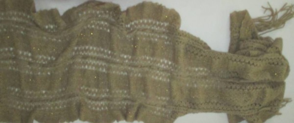 Wollschal, der mit einem goldenen Faden miteinander verwebt sind, sehr angenehm zu tragen, liegt seidenweich um den Hals in der Farbe cognac- braun. Ein wundervolles Accessoire, welches bestens mit jeder Jahreszeit Gargarderobe harmo-niert. Wunderbares Qualität: 85% Wolle / 15% Elasthan