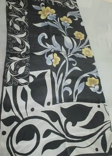 Schal Tuch wurde aus 100% Seide gefertigt - einer der edelsten Na-turfaser der Welt. Der Grundfarbton ist Marineblau. Das dekorative Muster weist die Farben weiss, hellblau, gelb auf. Es ergibt sich eine besonders schöne Farbkombination, die jedes Outfit aufwertet. Ein wundervolles Accessoire, welches sowohl zum