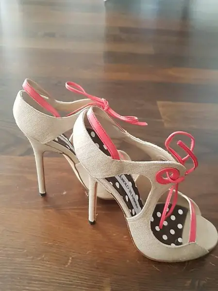 Manolo Blahnik Sandalen in beige mit koralle Farbakzenten.