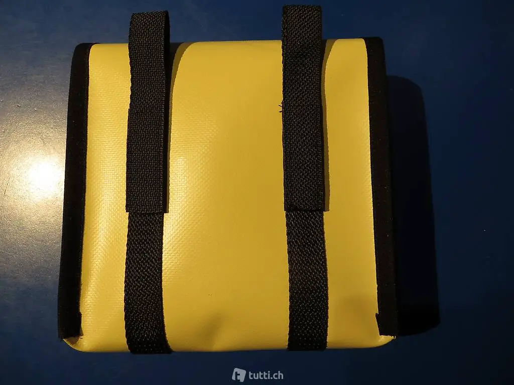 Tasche am Lenker befestigen. Leuchtstreifen auf dem Deckel. Beige Blache, Elfe.