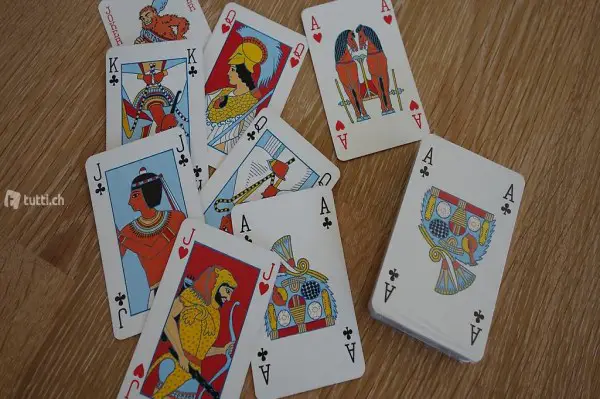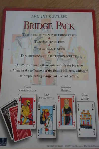 Schönes, ungewöhnliches und exklusives Bridgespiel mit ägyptischen und besonderen Symbolen aus dem Britischen Museums Shop von der Serie Ancient Cultures (Box mit 2 Karten-Sets und 2 Notizblöcken mit 2 Bleistiften, um die Resultate festzuhalten, Beschreibung der aussergewöhnlichen Illustrationen), neuwertig, nie gebraucht; ideal für das Ferienhaus oder als Geschenk, auch gut für Anfänger oder zum Üben oder zum Sammeln