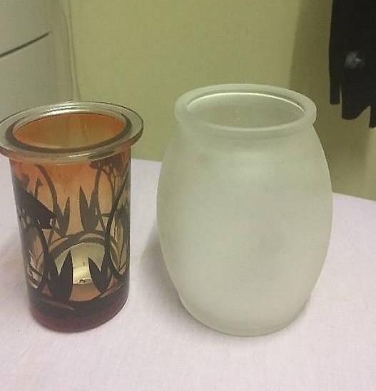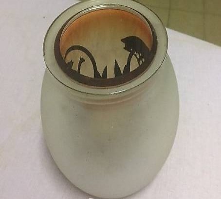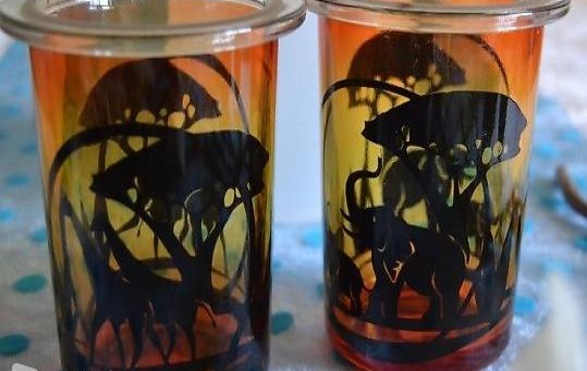 Glaseinsatz mit Elefantenmotiv und das andere mit Giraffenmotiv. Sehr dekorativ wenn man ein Teelicht anzündet sieht es aus als würden sich die Elefanten oder der Giraffe bewegen.