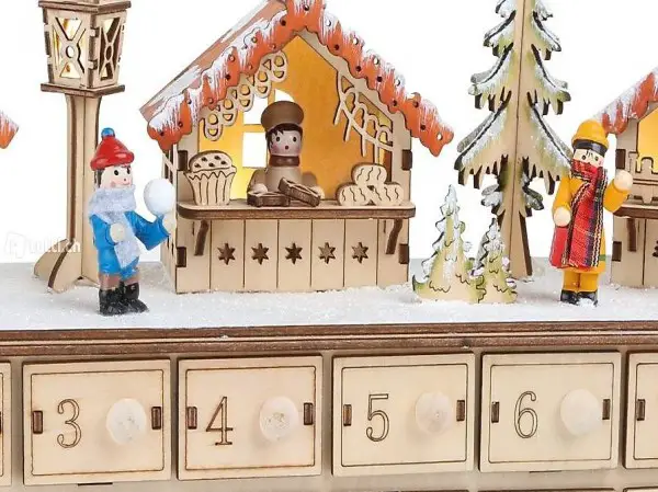 Qui n´a pas envie de flâner sur ce marché de Noël, qui de plus, est un calendrier de l´Avent ? Les petites maisonnettes en bois à la fine découpe sont posées sur de la neige scintillante. Sur les comptoirs, le café, les gâteaux et les jouets sont d´une vérité à s´y tromper. Il s´agira de remplir d´une petite surprise chacun des 24 tiroirs qui s´ouvrent à l´aide d´une poignée. Génial : lorsqu´il fait nuit, on peut allumer la lanterne et les lumières des maisonnettes à l´aide de l´interrupteur situé à l´arrière.