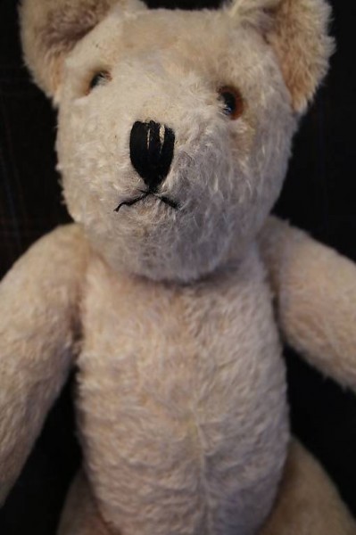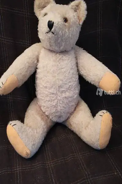Holzwolle gestopft, 1 Pfote und 1 Fuss defekt, hat die Stimme verloren. Schätzpreis 300.-- Günstige und fachgerechte Reparaturadresse gebe ich bei Kauf bekannt.