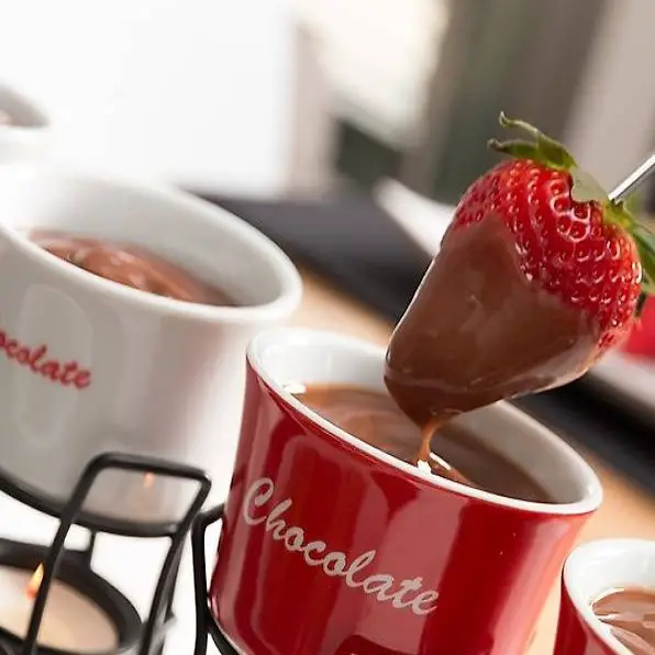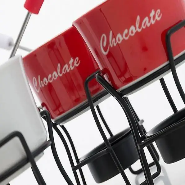 Profitez du plaisir du chocolat avec les mini-fondues Chocolat (pack de 4) ! Idéales également comme décoration grâce à leur design attrayant. Le système pour chauffer utilise une bougie. Comprend quatre petits bols en céramique (capacité env. : 100 ml), quatre supports métalliques et quatre mini-fourchettes à fondue (longueur env. : 15 cm). Bougies non incluses. Dimensions env. du bol avec support (diamètre x hauteur) : 7,5x11 cm.