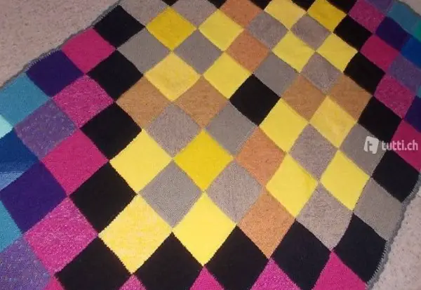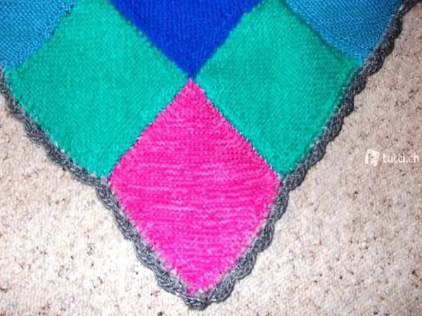 Wolle (verschiedene) gestrickt. Sie besteht aus 9x13 Quadraten welche "diagonal" und teils doppelt gestrickt wurden um der Decke mehr Struktur und Form zu geben. Die Decke hat einen gehäkelten Abschluss in grau