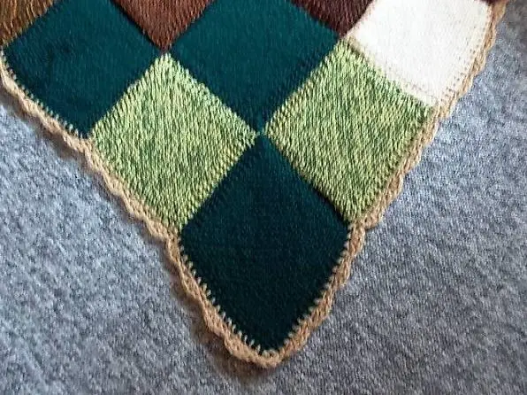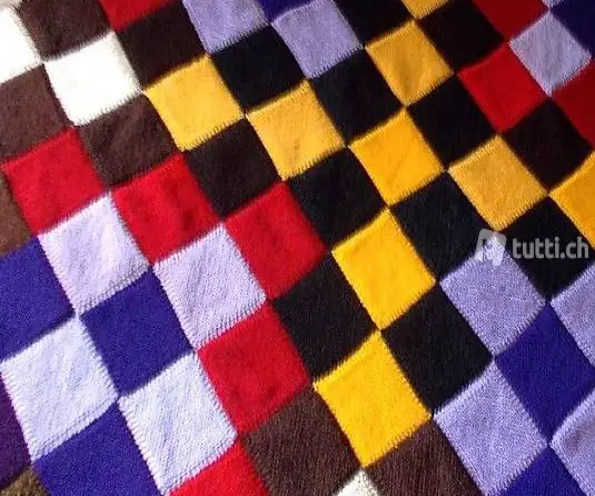 Wolle (verschiedene) gestrickt. Sie besteht aus 9x13 Quadraten welche "diagonal" und teils doppelt gestrickt wurden um der Decke mehr Struktur und Form zu geben. Die Decke hat einen gehäkelten Abschluss in beige.
