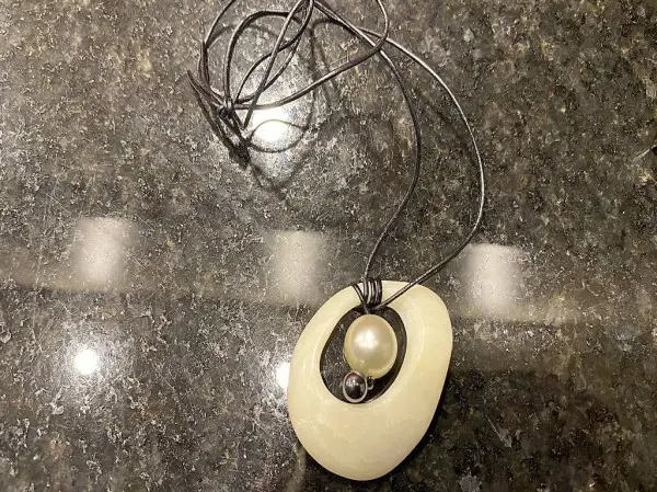 Den Stein habe ich selbst bearbeitet und ist einzigartig. Ich habe sehr fein gearbeitet, sodass die Kette leicht und elegant ist.
