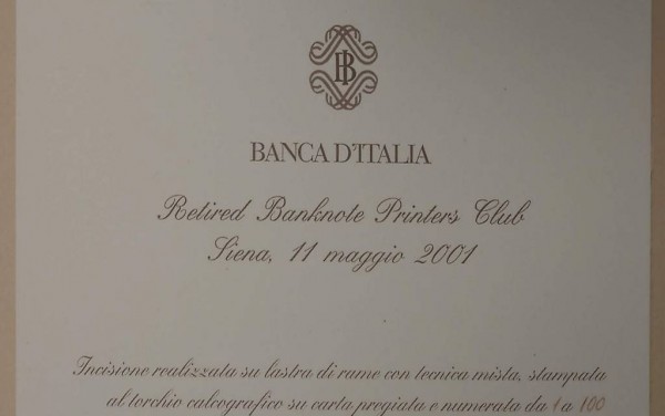 Verkaufe ein original Gravur von Banca d'Italia - Retired Banknote Printers Club.