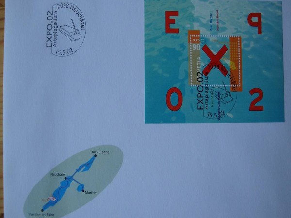 Briefumschlag: Gruss von der Expo.02; Viererblock Sondermarken Expo 02 ungestempelt; 4er Set Sonderumschläge Expo.02, Serie auf Ersttagsumschlag gestempelt (Arteplage Biel, Arteplage Murten, Arteplage Neuchâtel, Arteplage Yverdon); 1 Briefumschlag mit 0.90 CHF