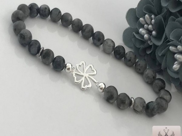 Labradoritgummiarmband mit Kleeblatt Verbinder aus 925 Silber.
