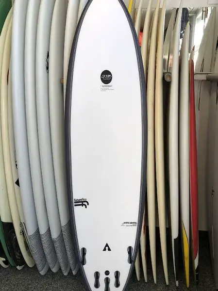 New surfboard 6-0x20 1/2x2 3/4 with 36,33 Liters of volume. Carbon epoxy construction with 5 x FCS 2 fins systems. Available at the first real Surfshop in Switzerland since 1995, located in Regensdorf. Please contact me for a appointment at the Shop, I am able to communicate in Swiss German, German, English, Italian, Spanish and Portuguese. Attached illustrative surfing pictures.